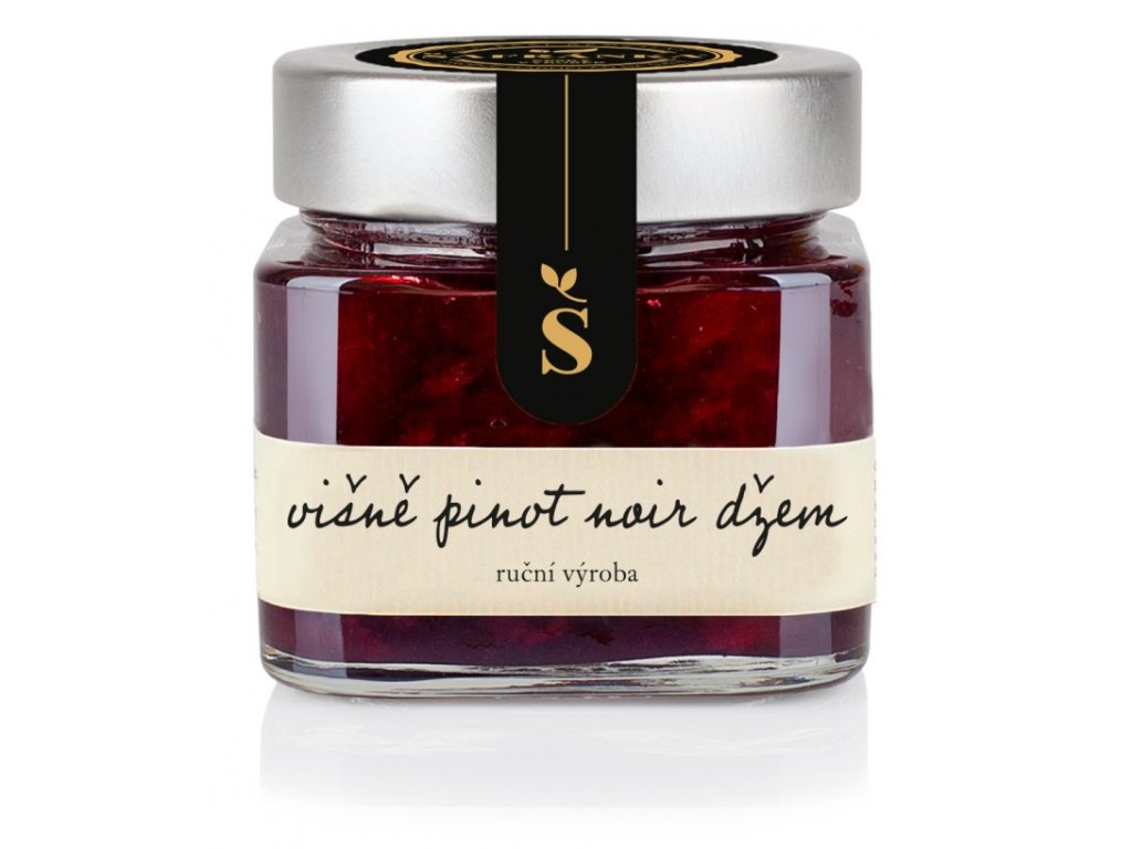 Jednu skleničku džemu (270g) po okraj naplňuje více než 350g višní, třtinový cukr a Pinot Noir.