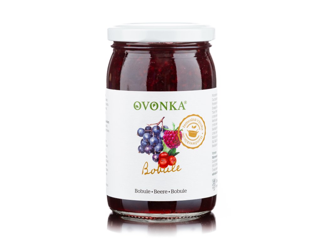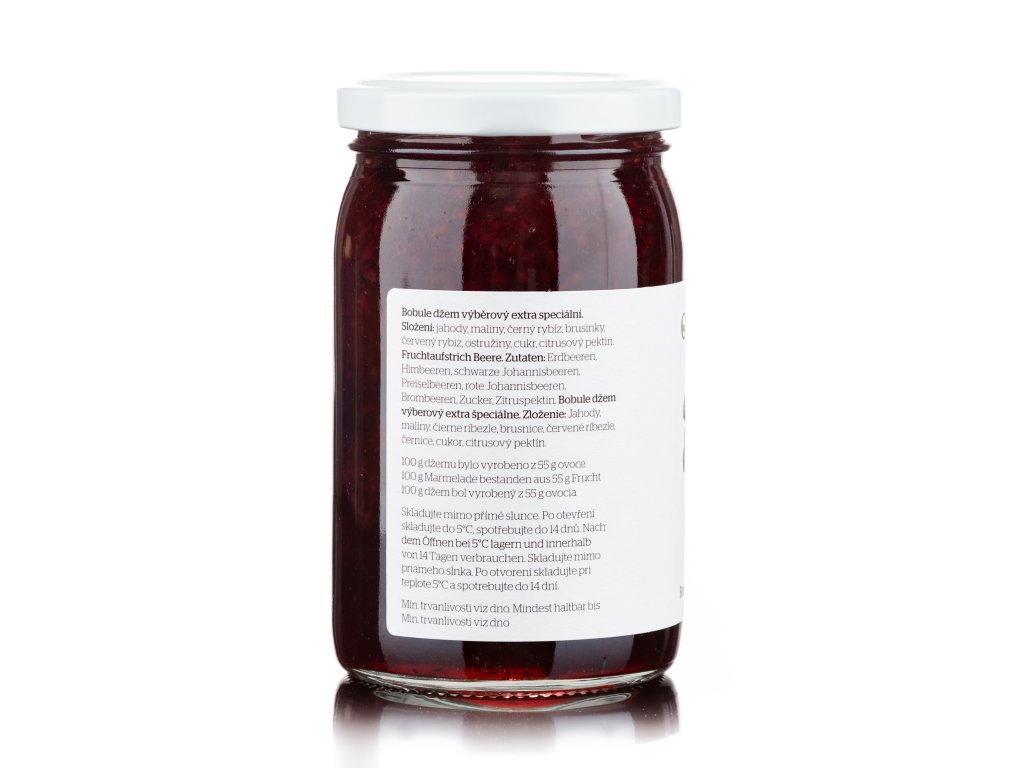 Jemná kombinace sezónních plodů – jahody, maliny, brusinky, ostružiny a černý a červený rybíz. Džem s bohatou, vrstvenou chutí, která nikdy nenudí.