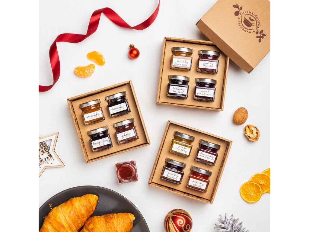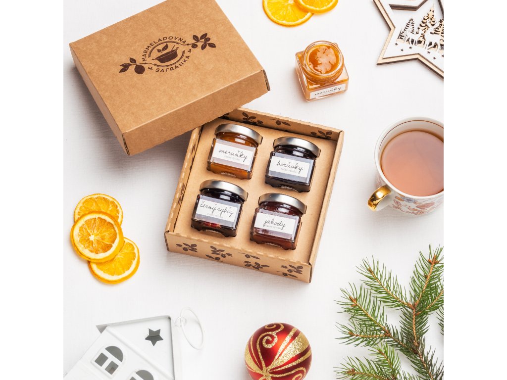 Naše dárková krabička ukrývá čtyři mini skleničky ručně vařených marmelád z rodinné manufaktury Šafránka – meruňky, borůvky, jahody a černý rybíz.