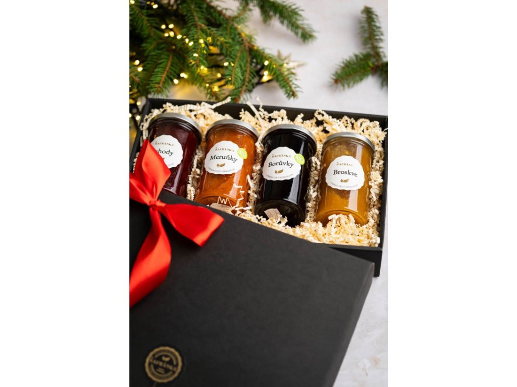 Dárkové balení bio ručně vyrobených džemů Šafránka v kraftové krabičce s mašlí.