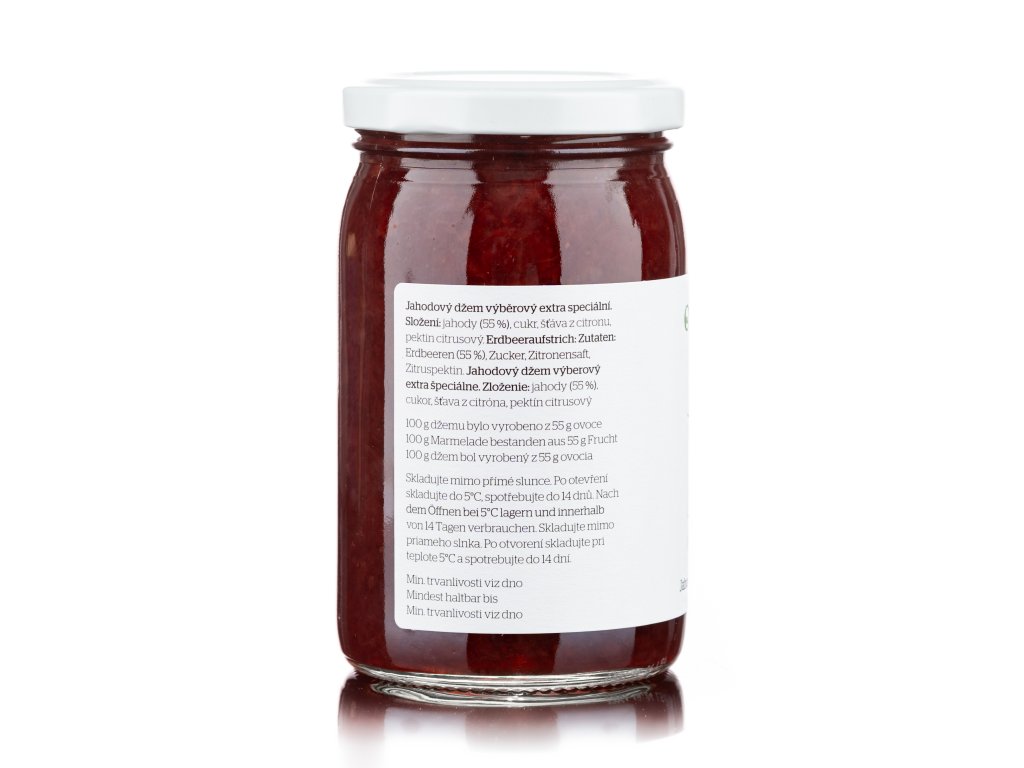 Sladké, voňavé jahody, ručně zpracované a šetrně povařené tak, aby si zachovaly maximum své přirozené chuti i barvy. Na 100 g džemu jsme použili 55 g čerstvých jahod – a je to znát.