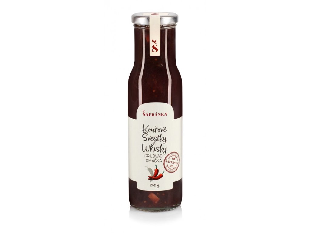 Jednu skleničku grilovací omáčky (300 g) až po okraj naplňují švestky, melasa, hořčičné semínko, bourbon whisky, uzená sůl, pepř, cibule, česnek, zázvor a jalapeňos papričky.
