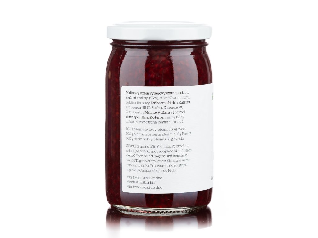Na 100 g džemu bylo použito 55 g malin, takže v každých 100 g je 53 g ovoce.